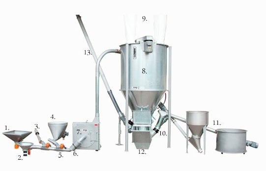 Lopbarības ražošanas sistēma ar pneimatisku malšanas komponentu padevi.